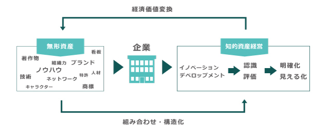 つまり、知的資産や無形資産とこれらを生み出す仕組みとの関係性に着目して、知的資産を生み出し、組み合わせ、 企業の経済的価値へと昇華させる試みを「知的資産経営」と呼びます。